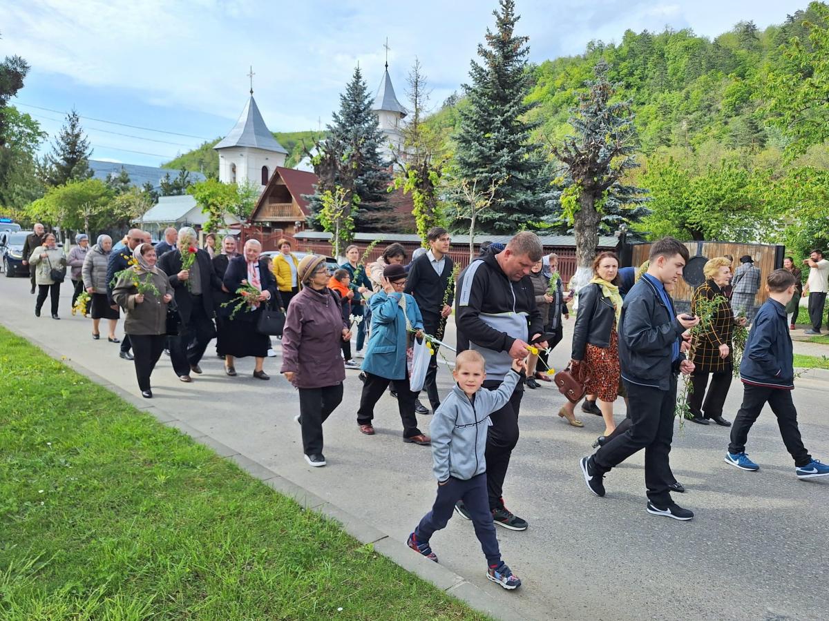 La ora 16,00, în răsunet de cântări specifice praznicului Floriilor, încolonați după Icoana Intrării Mântuitorului în Ierusalim purtată de bărbați îmbrăcați în sumane tradiționale, membri ai Corului bărbătesc al Parohiei „Sfântul Haralambie”, Tg. Neamț, credincioșii pelerini s-au îndreptat spre Catedrala orașului.